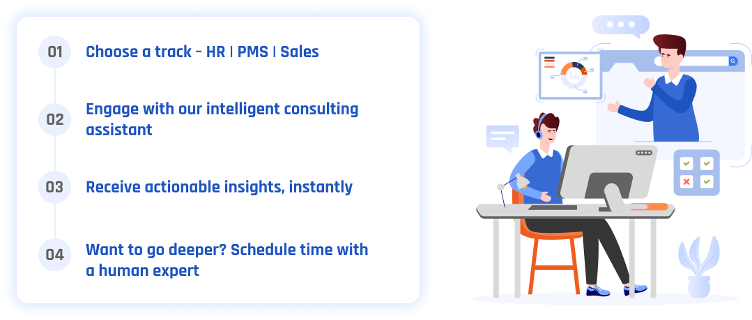 Our virtual consulting interface allows you to interact with a curated AI- powered experience, designed by our senior consultants. Whether you’re fine- tuning your incentive plans, evaluating your PMS, or designing your sales org structure — you’re never far from the answers you need.